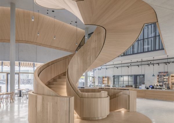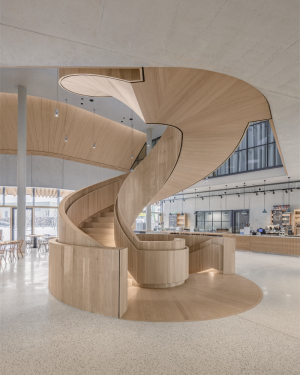 Stikla iekšējās starpsienas paver panorāmas skatu uz kafijas grauzdēšanas procesu un maiznīcu. Aizraujoša spirālveida kāpņu skulptūra savieno pirmo stāvu ar galeriju augšpusē. Ir izmantoti dabiski un atjaunojami būvmateriāli, piemēram, koks un māls, un būvniecības pakalpojumi ir samazināti līdz minimumam.